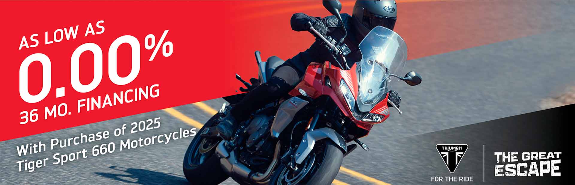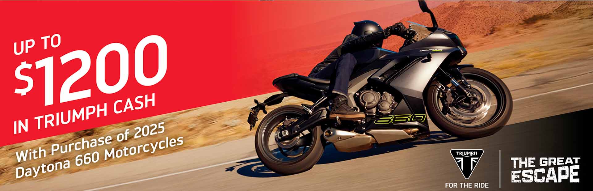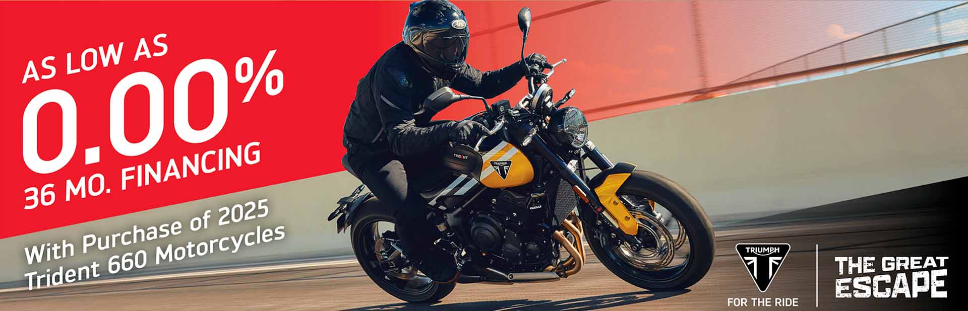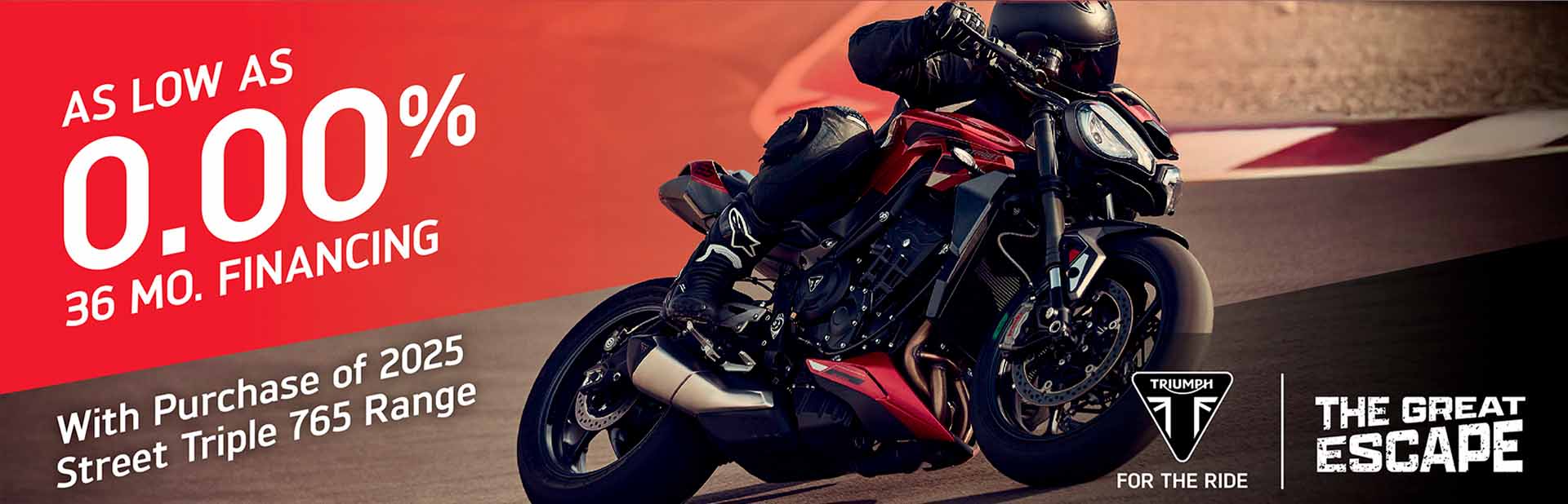 The Great Escape promotion offers bold incentives for riders to escape high interest rates on the purchase of a new Triumph motorcycle, with the lowest financing rates in the industry. Below is a summary of the January offers.